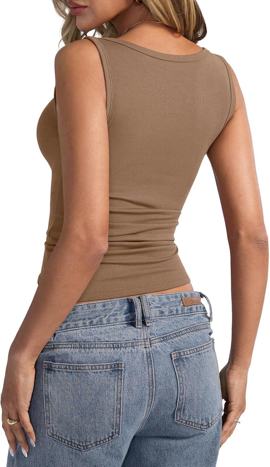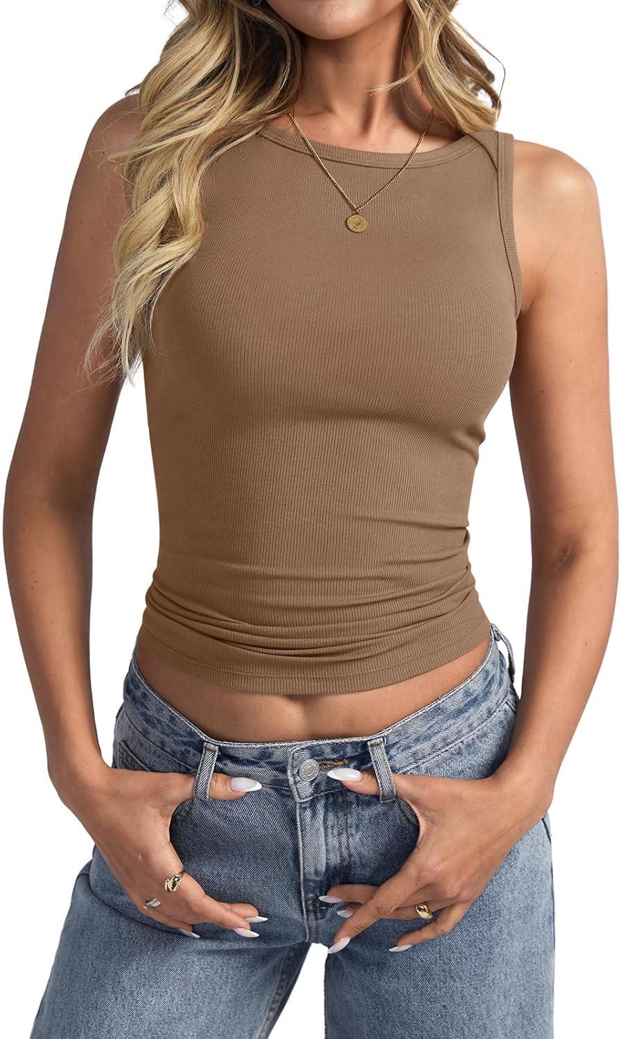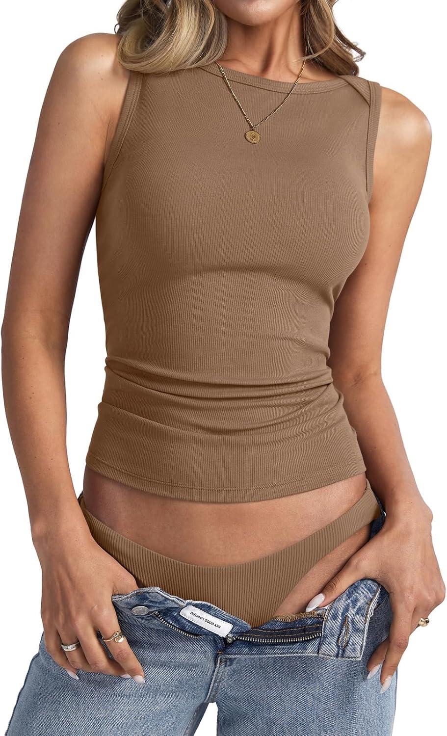 Womens Sleeveless Ribbed Tank Tops Boat Neck Slim Fit Shirts Summer Beach Vacation Clothes(Light Brown)