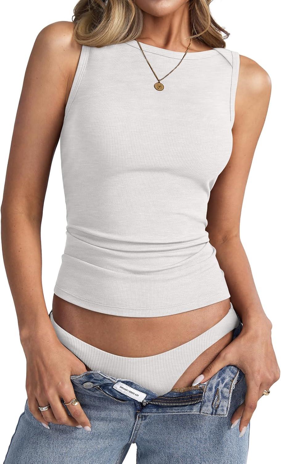 Womens Sleeveless Ribbed Tank Tops Boat Neck Slim Fit Shirts Summer Beach Vacation Clothes(White)