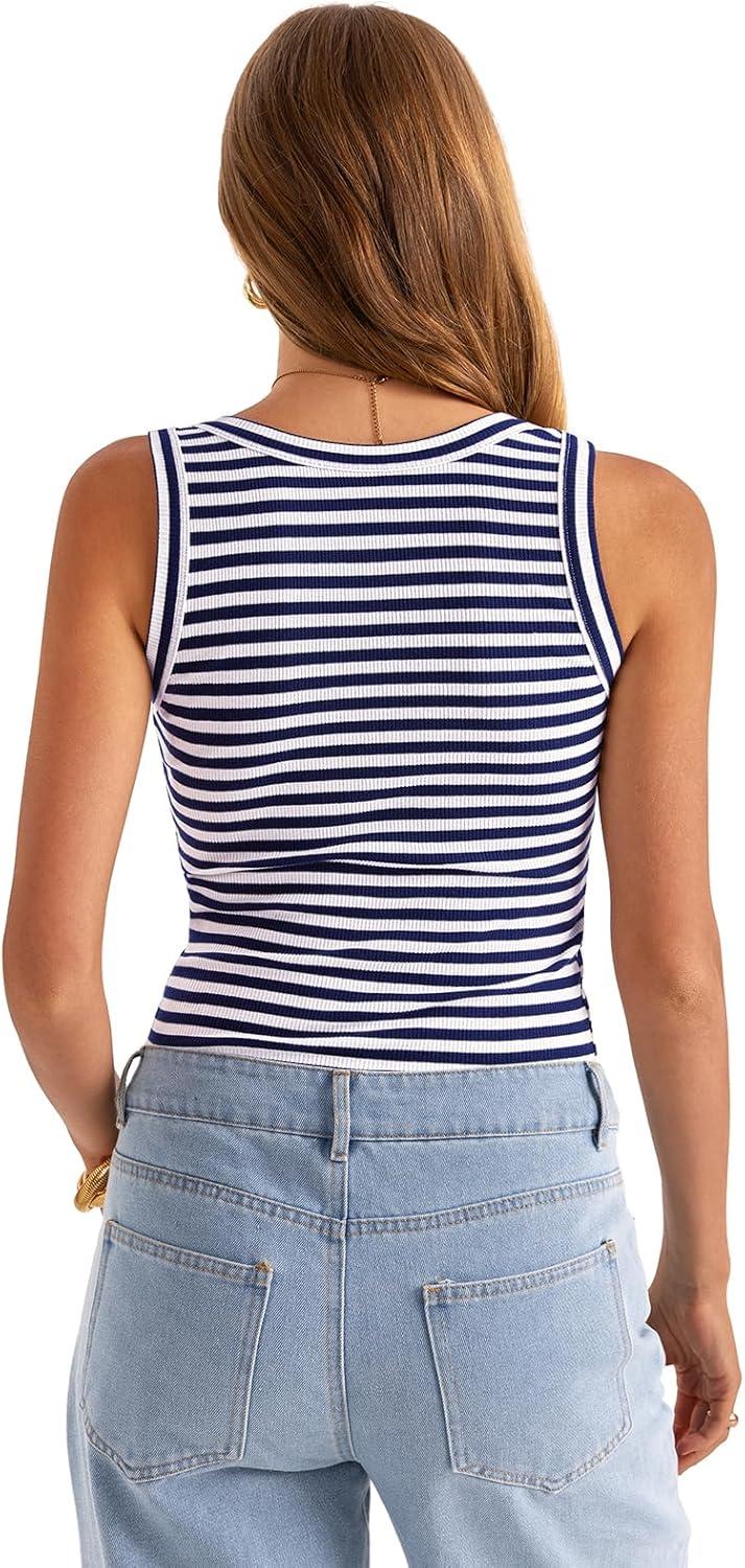 Womens Square Neck Ribbed Tank Tops Sleeveless Basic Tops Sexy Slim Fit Summer Clothes 2025(Blue White Stripe)