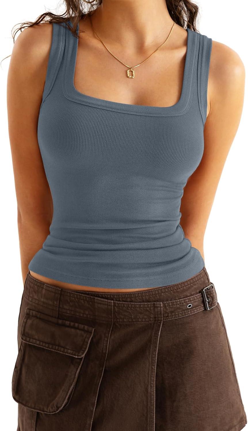 Womens Square Neck Ribbed Tank Tops Sleeveless Basic Tops Sexy Slim Fit Summer Clothes 2025(Grey Blue)