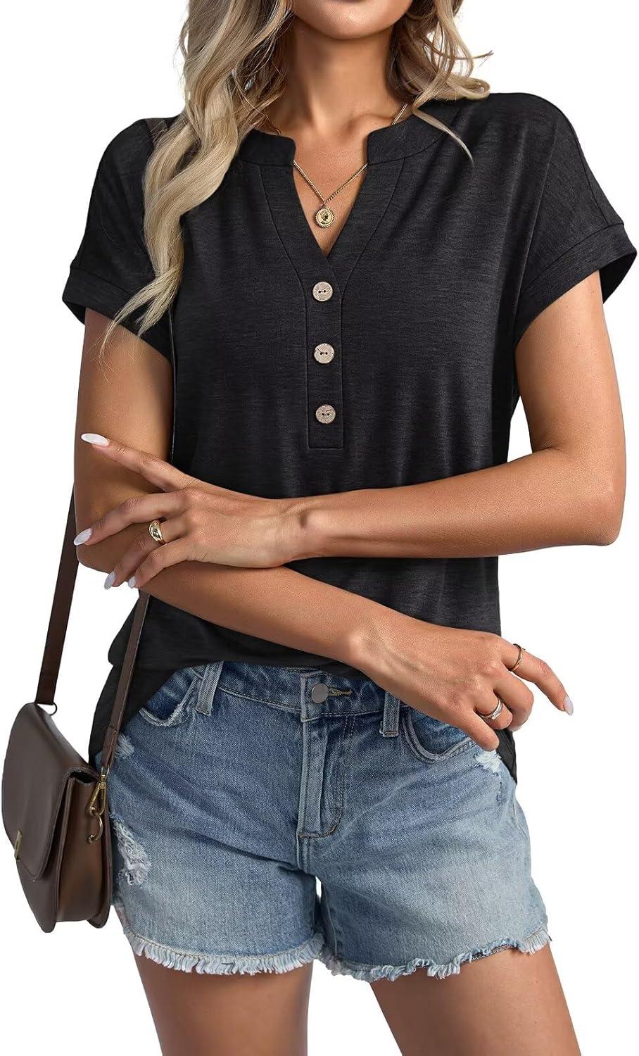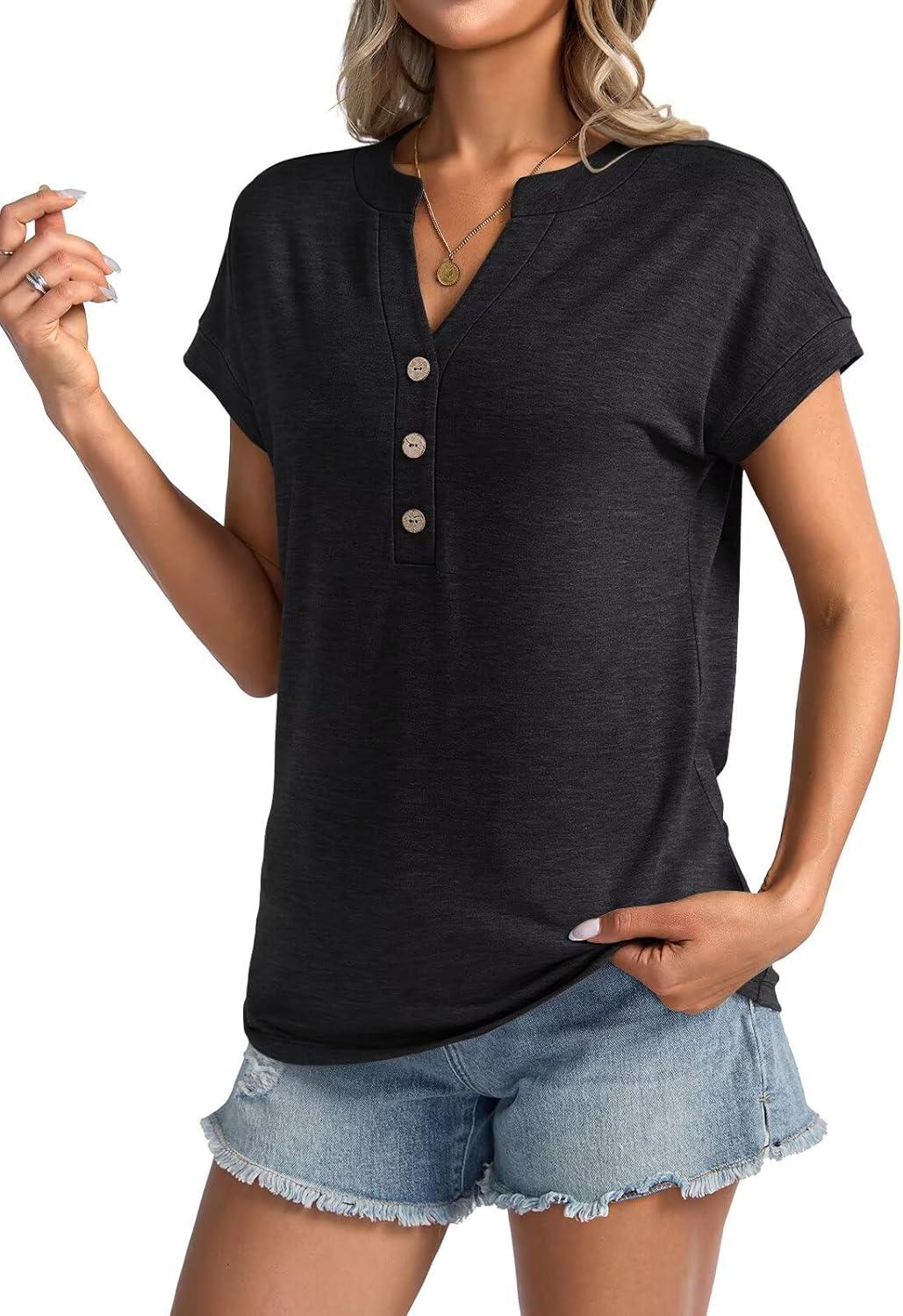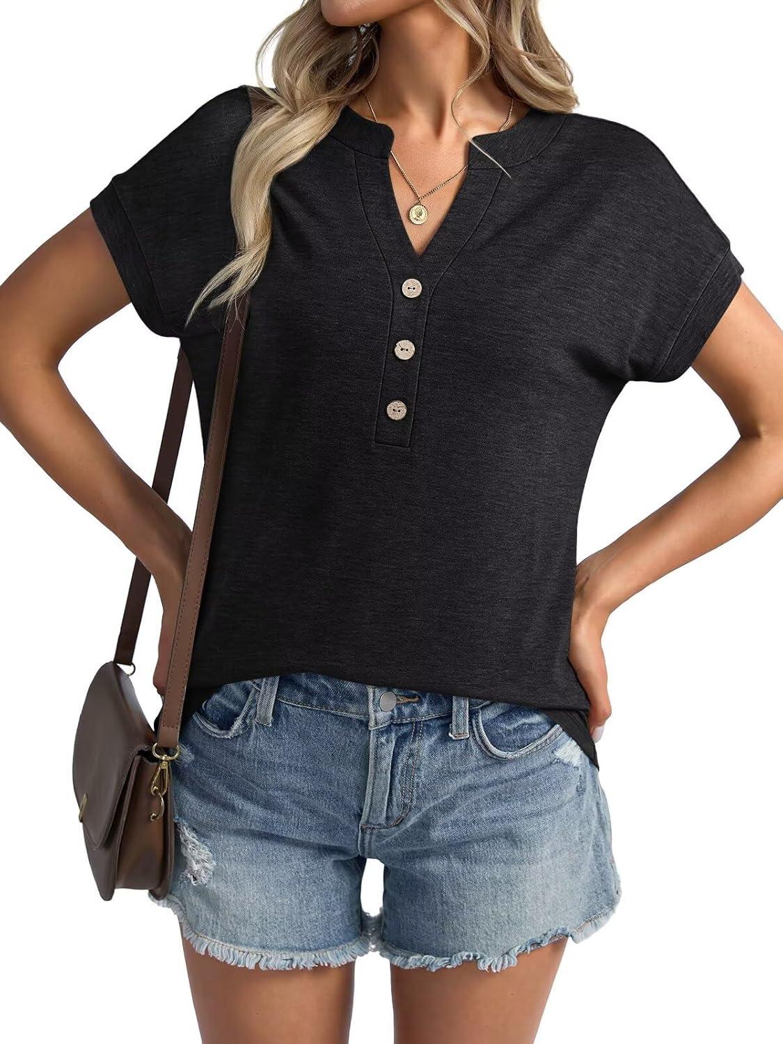 Womens V Neck Cap Sleeve Tops Summer Casual Short Sleeve Shirts Loose Fit Basic Work Tee Trendy Clothes 2025(Black)