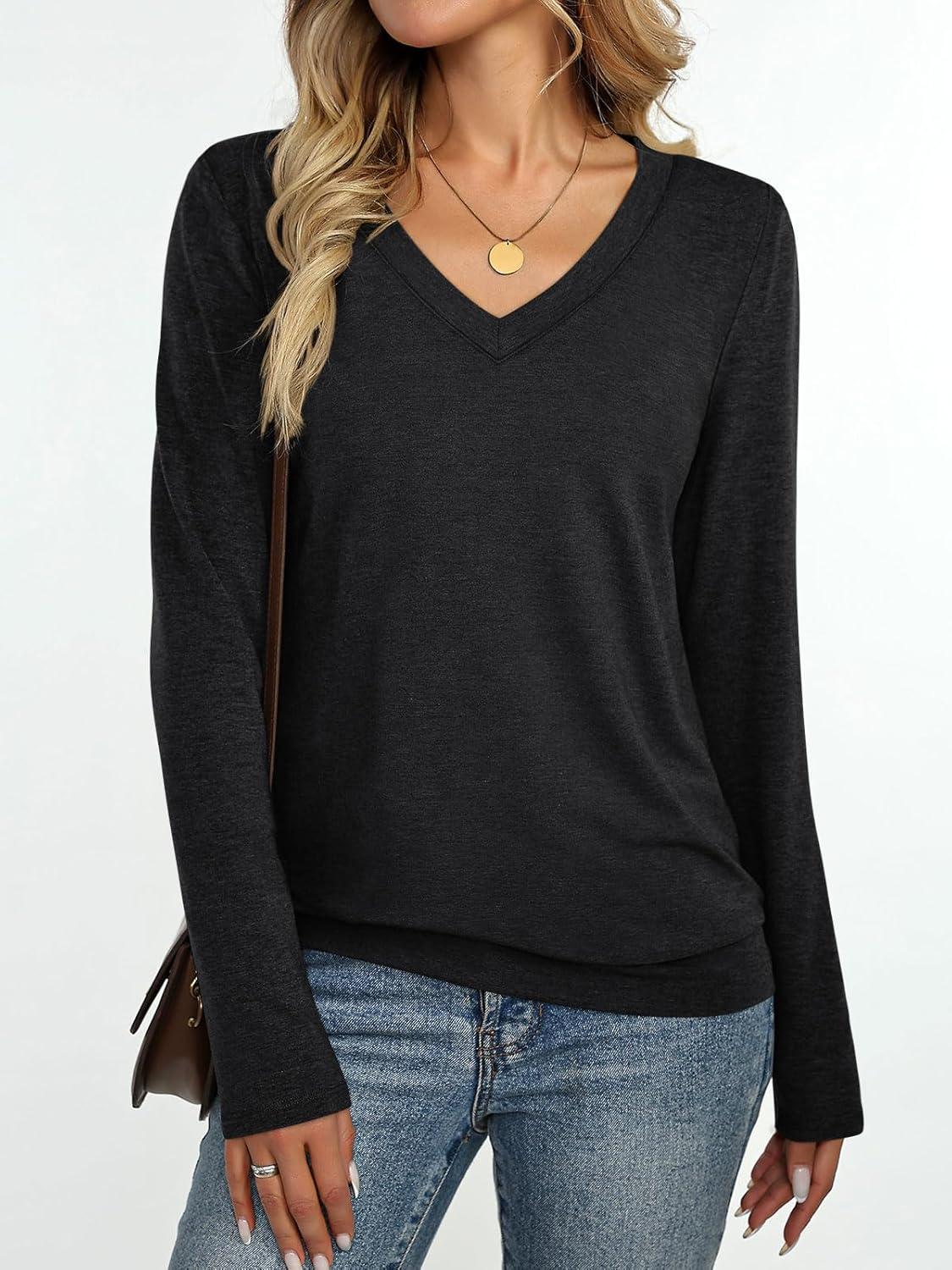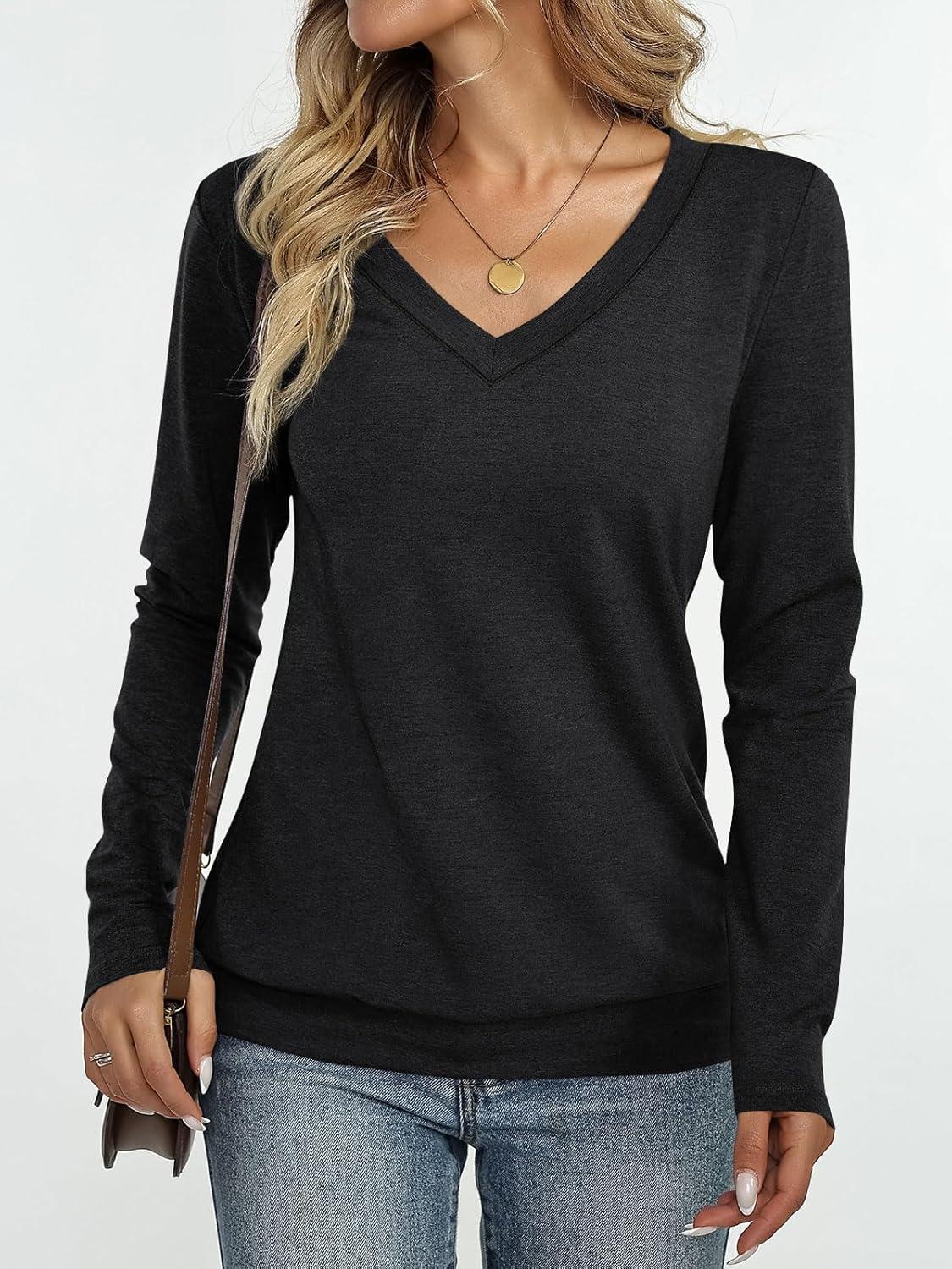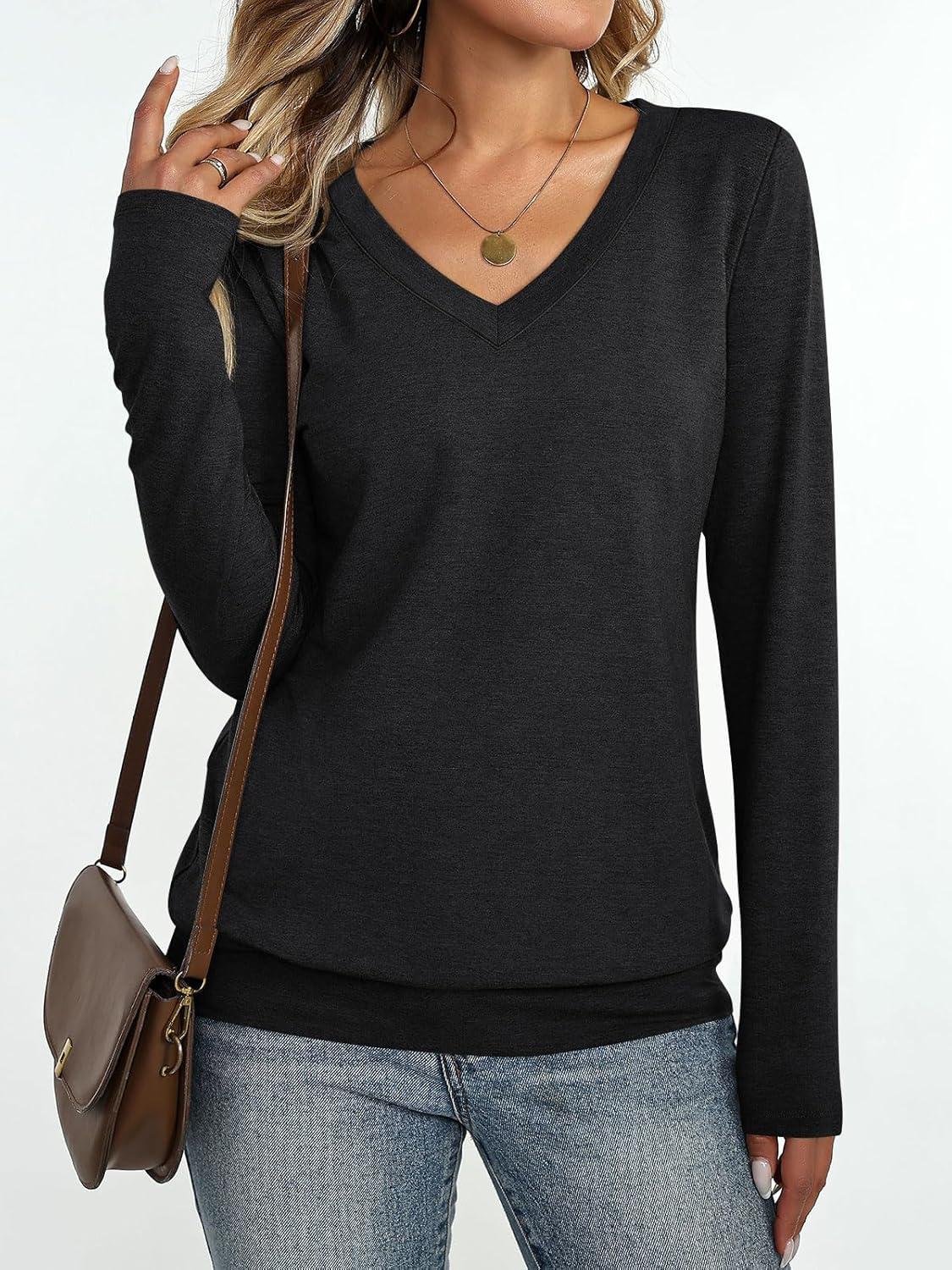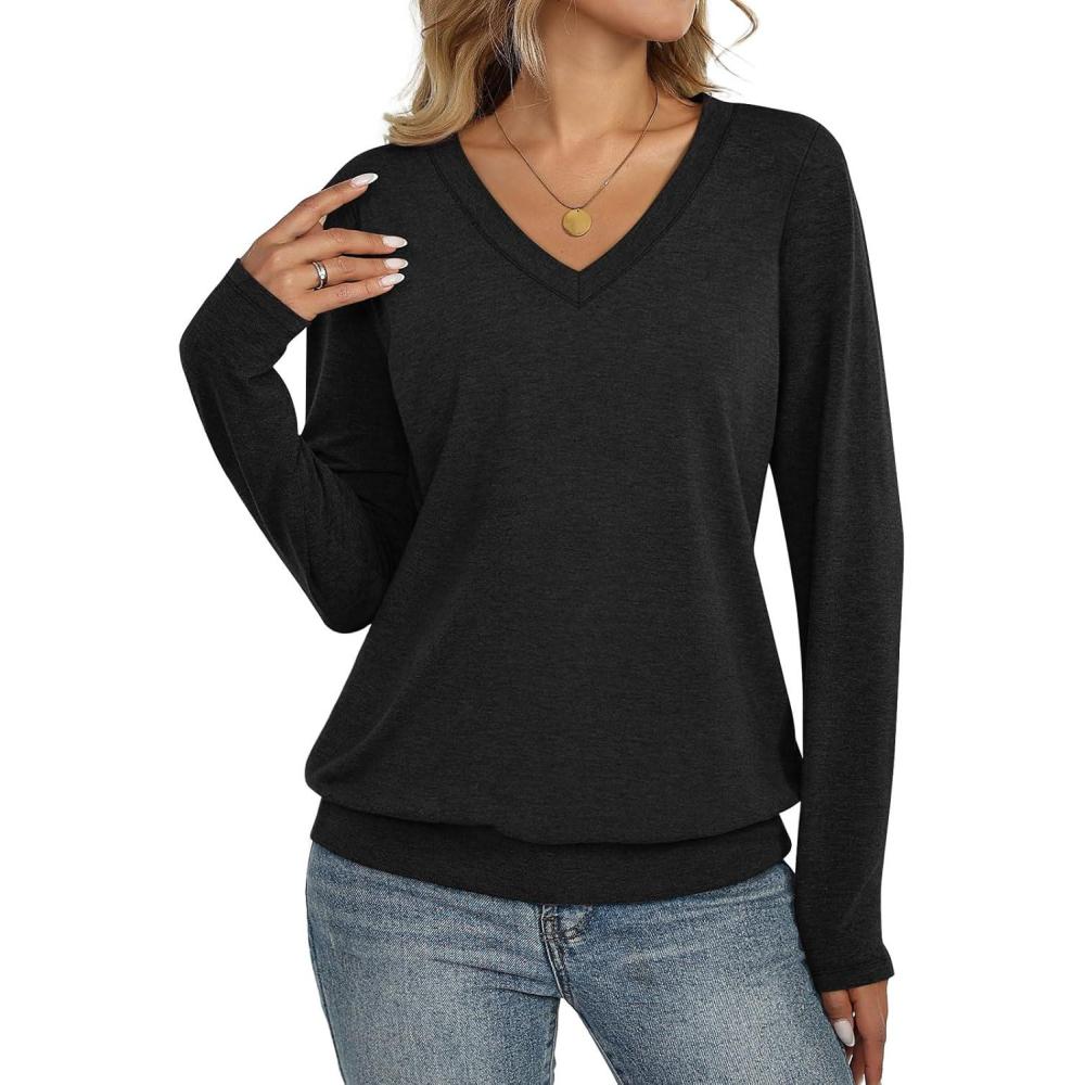 Womens V Neck Long Sleeve Shirts Banded Bottom Cute Loose Fit Tops Dressy Casual Outfits for Fall Spring(Black)
