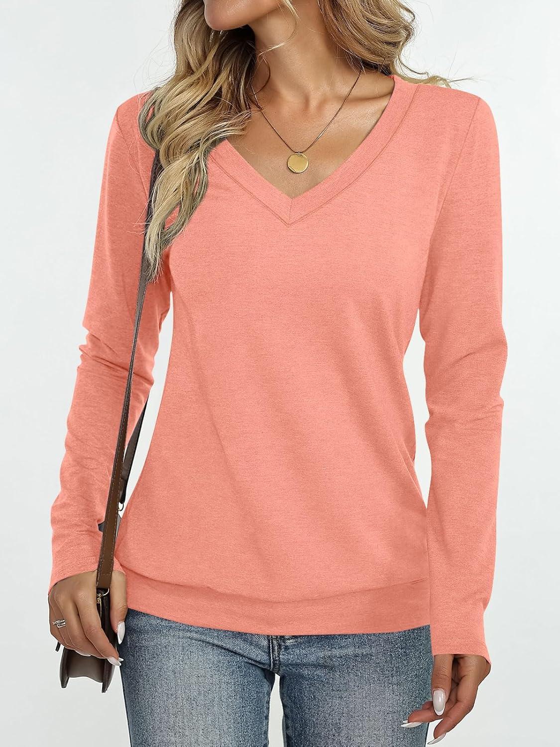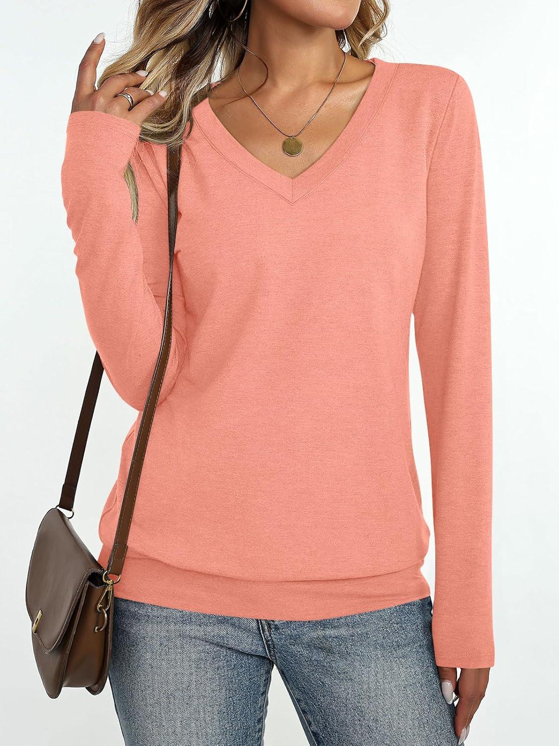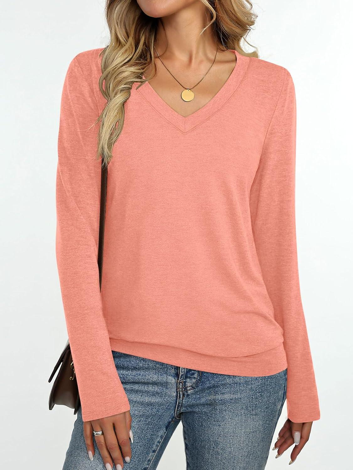 Womens V Neck Long Sleeve Shirts Banded Bottom Cute Loose Fit Tops Dressy Casual Outfits for Fall Spring(Coral)