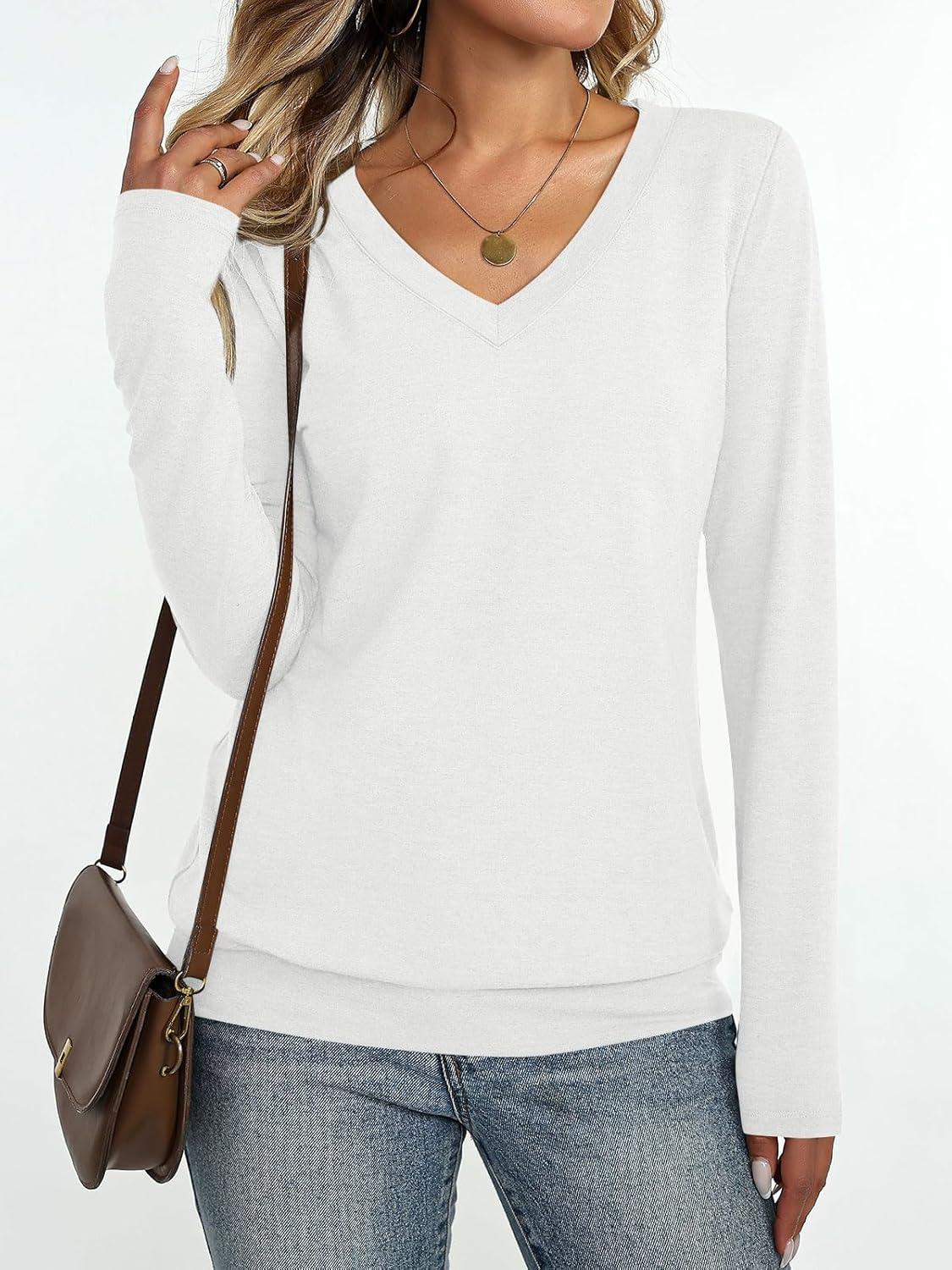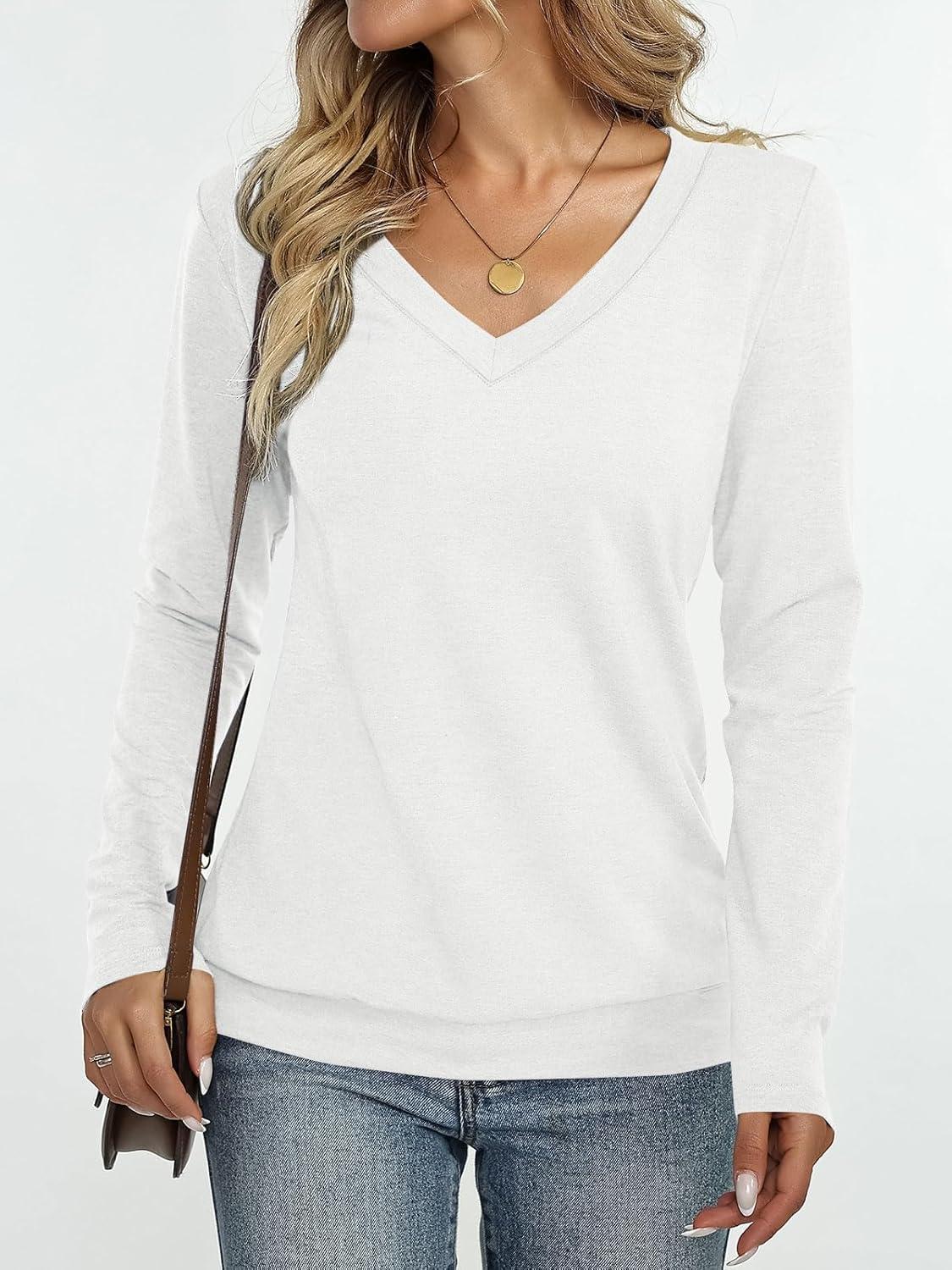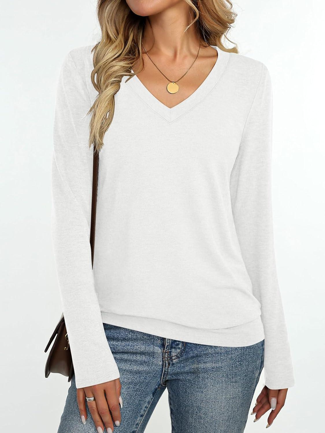 Womens V Neck Long Sleeve Shirts Banded Bottom Cute Loose Fit Tops Dressy Casual Outfits for Fall Spring(White)