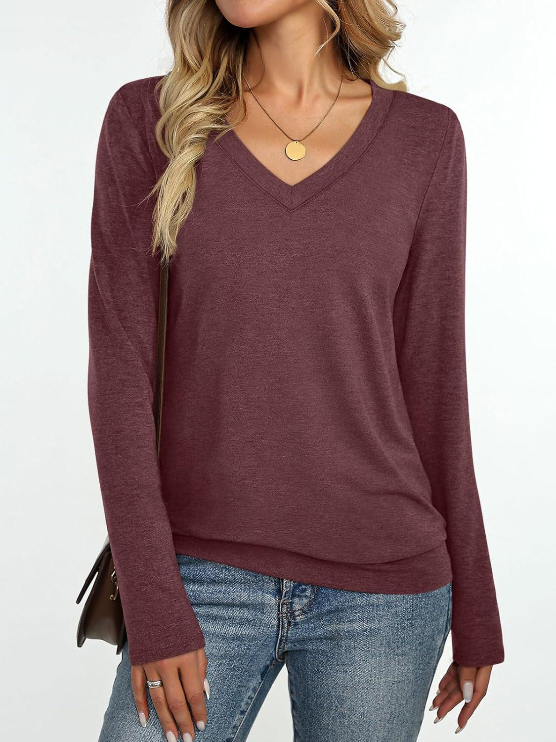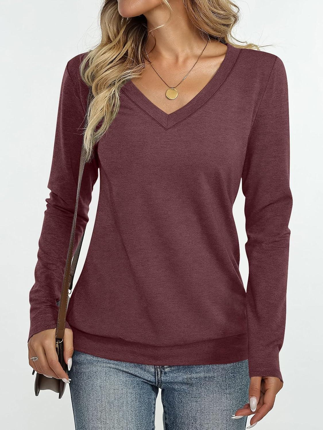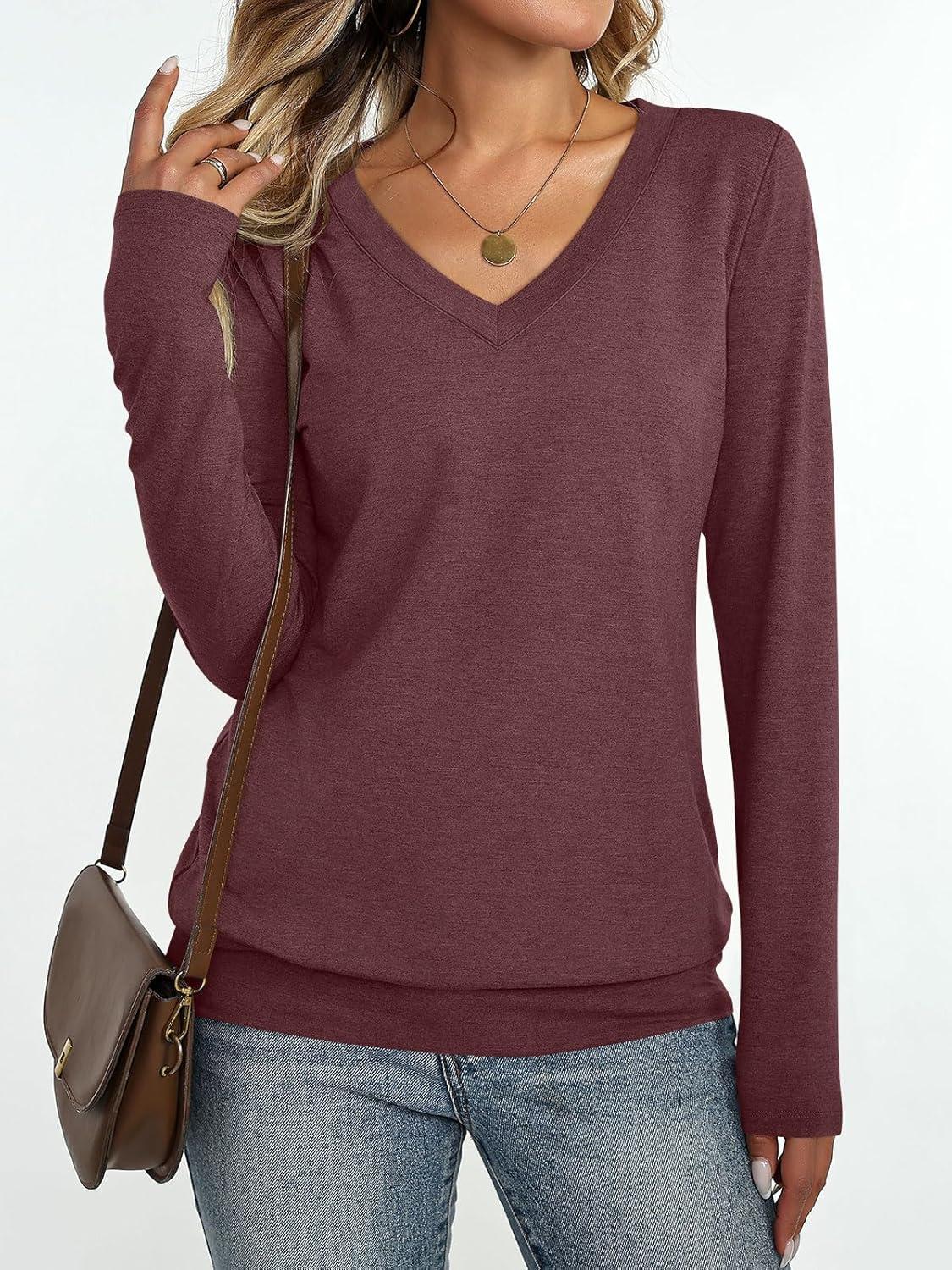 Womens V Neck Long Sleeve Shirts Banded Bottom Cute Loose Fit Tops Dressy Casual Outfits for Fall Spring(Wine Red)