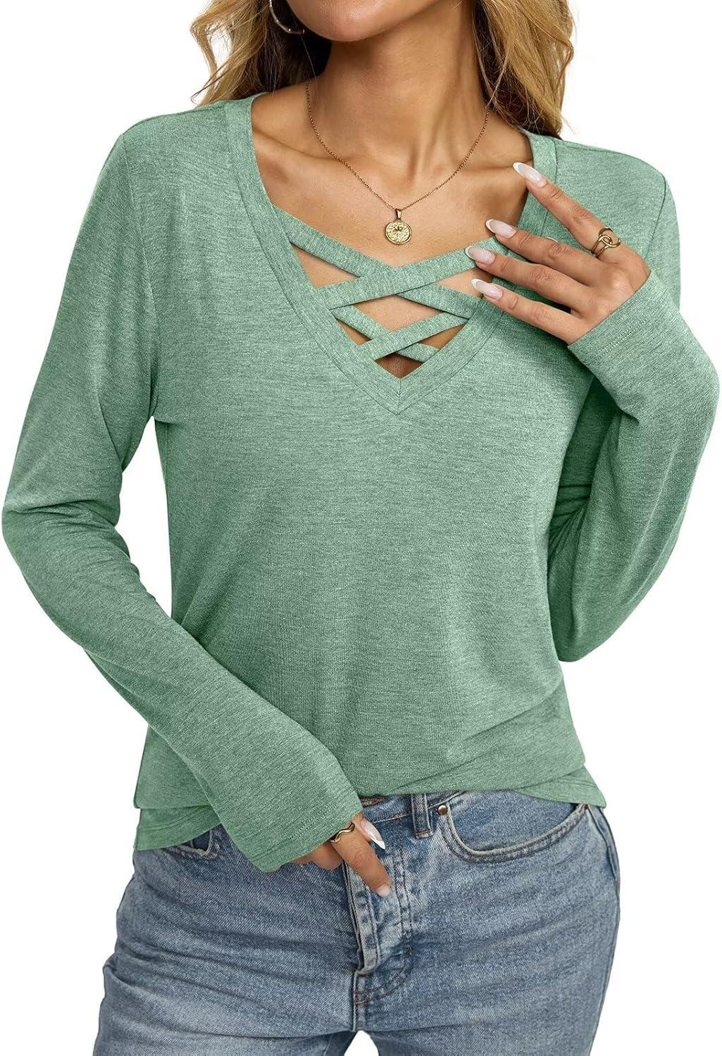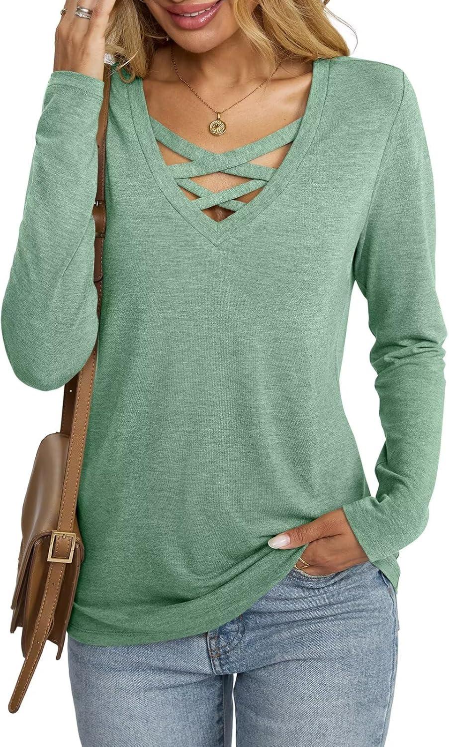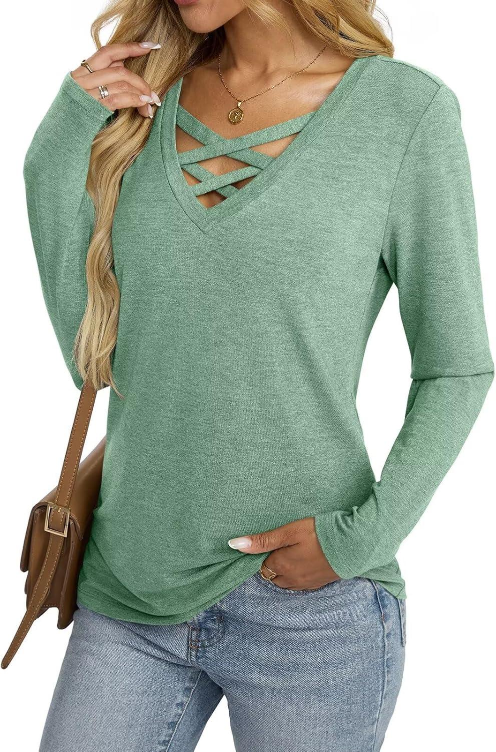 Womens V Neck Long Sleeve Shirts Criss Cross Sexy Tops Casual Loose Fit Tee Going Out Fall Fashion Clothes 2025(Green)