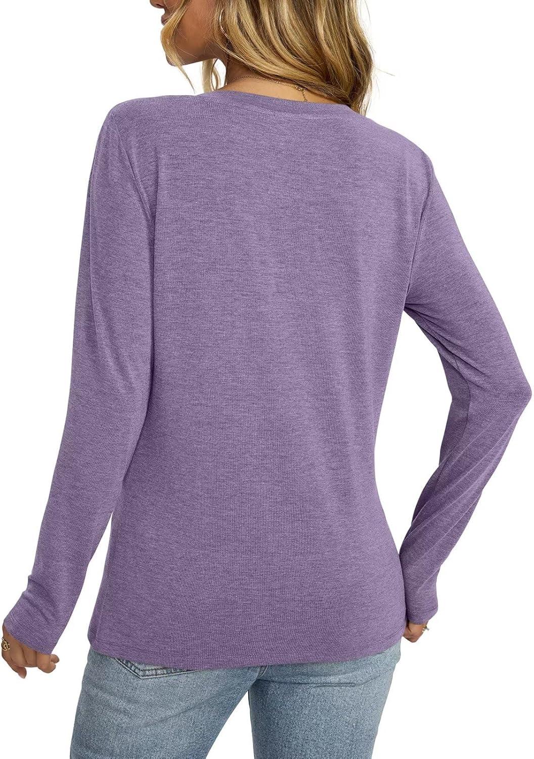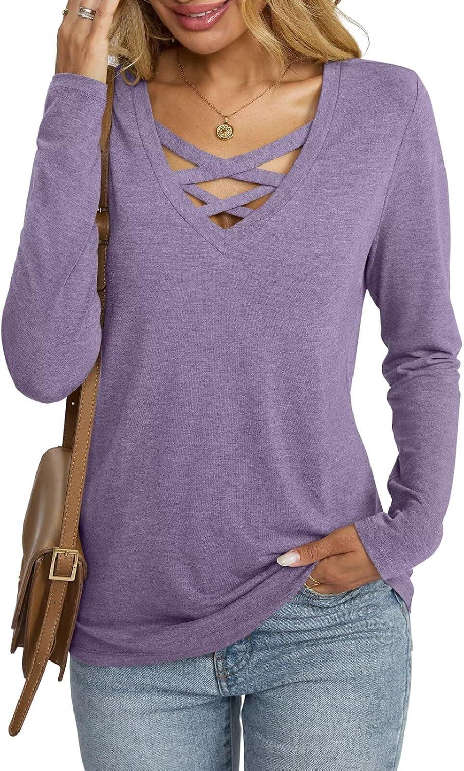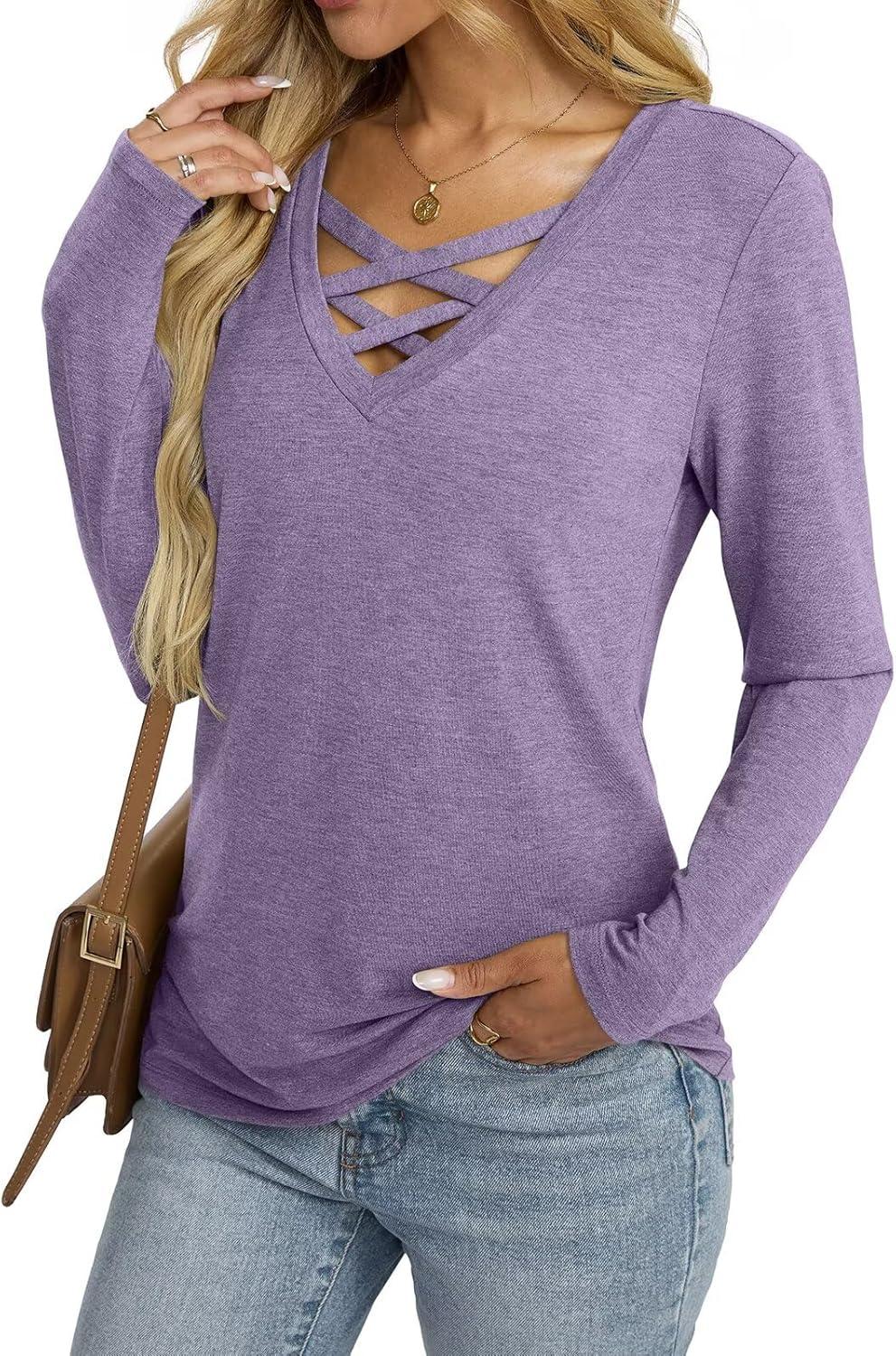 Womens V Neck Long Sleeve Shirts Criss Cross Sexy Tops Casual Loose Fit Tee Going Out Fall Fashion Clothes 2025(Purple)
