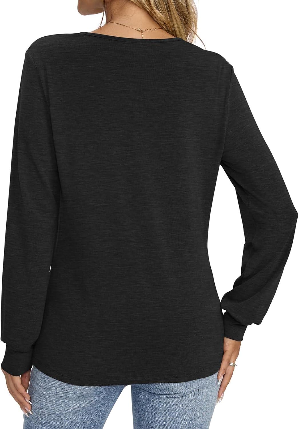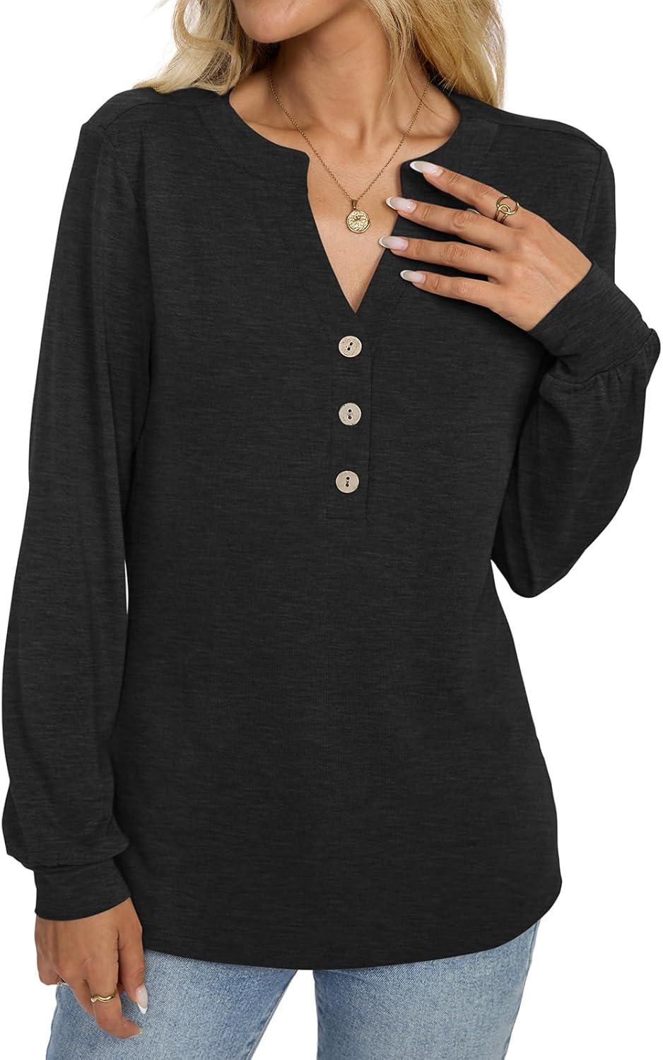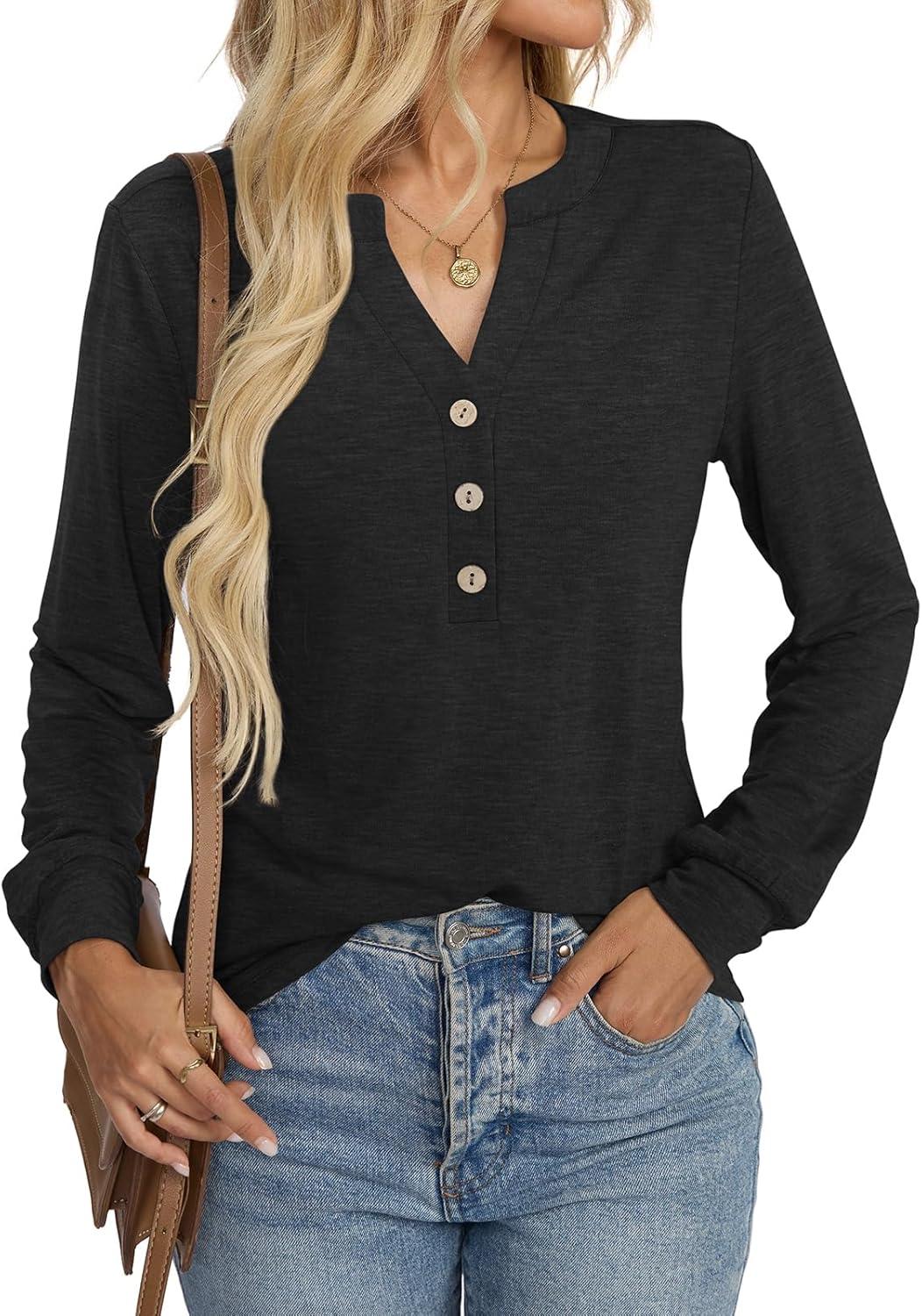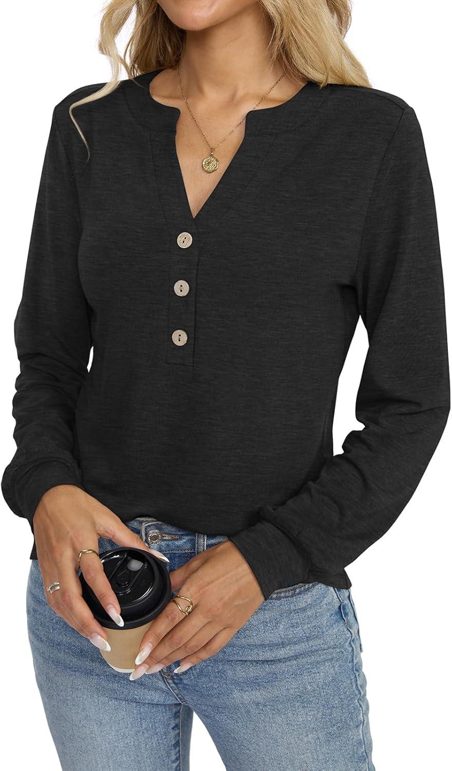 Womens V Neck Long Sleeve Shirts Henley Dressy Casual Tops Loose Fit Trendy Tees Fall T Shirts Outfits 2025(Black)