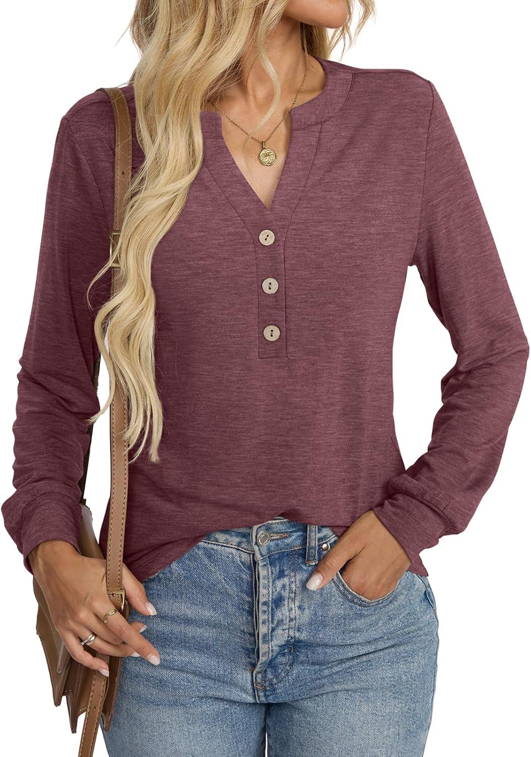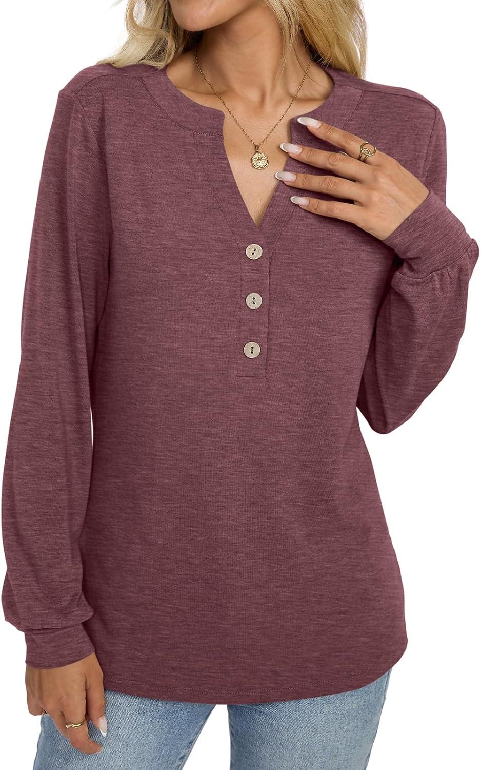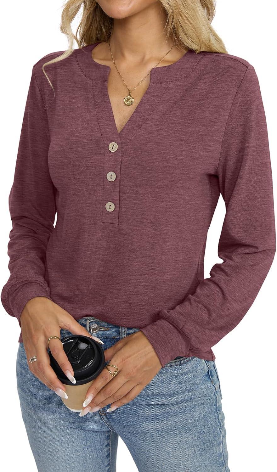 Womens V Neck Long Sleeve Shirts Henley Dressy Casual Tops Loose Fit Trendy Tees Fall T Shirts Outfits 2025(Red Brown)