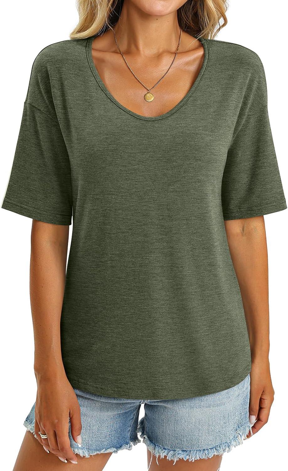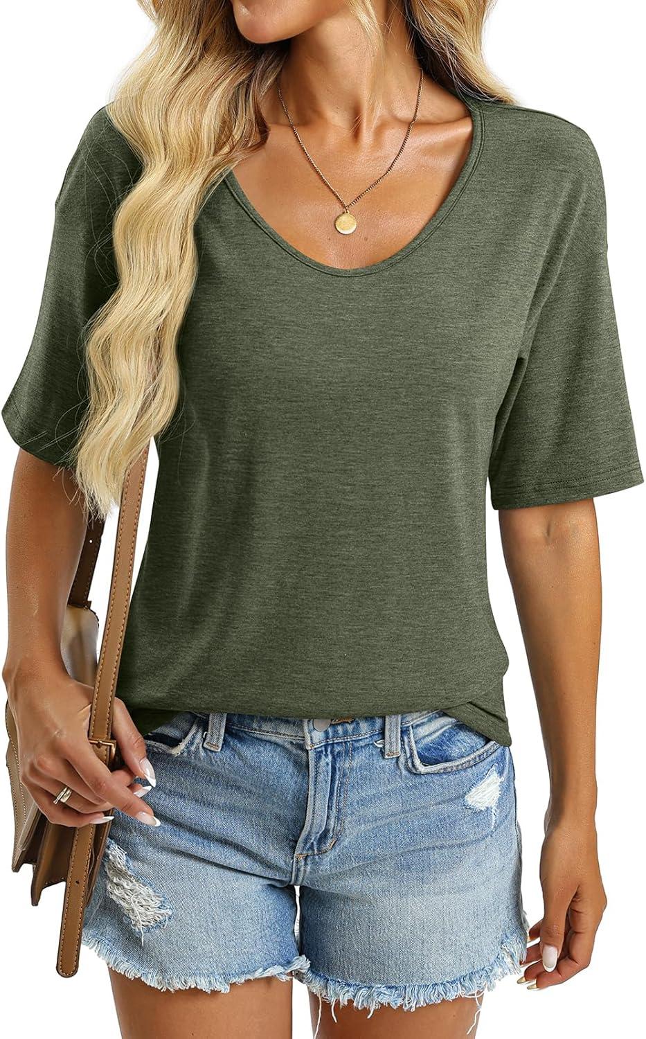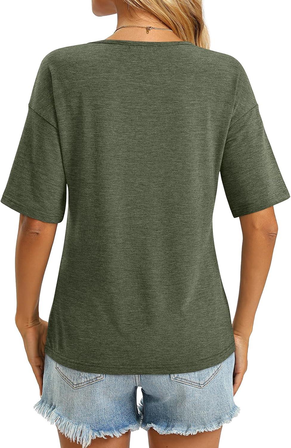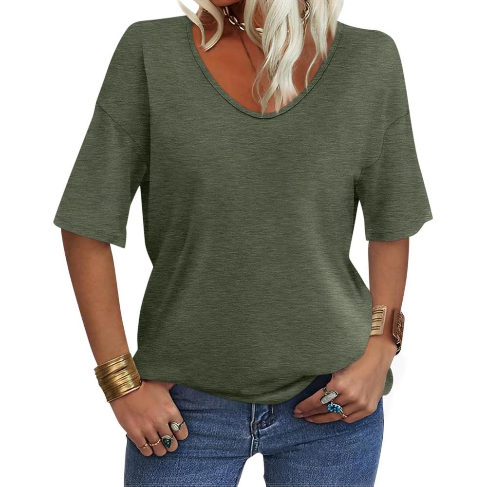 Women’s V Neck Tops Elbow Length Shirts Loose Fit Summer Tops Basic Tees(A Army Green (Elbow Sleeve))