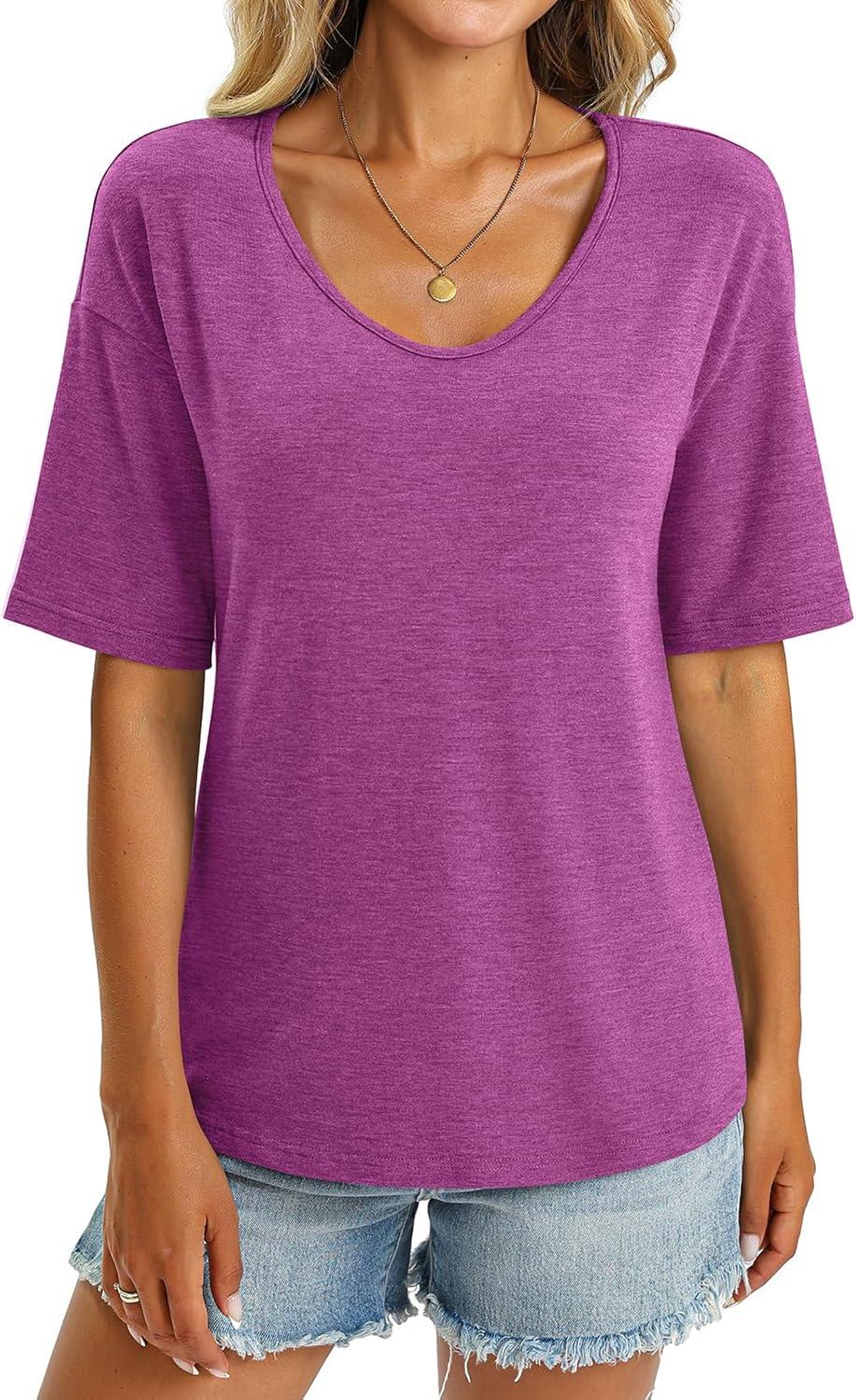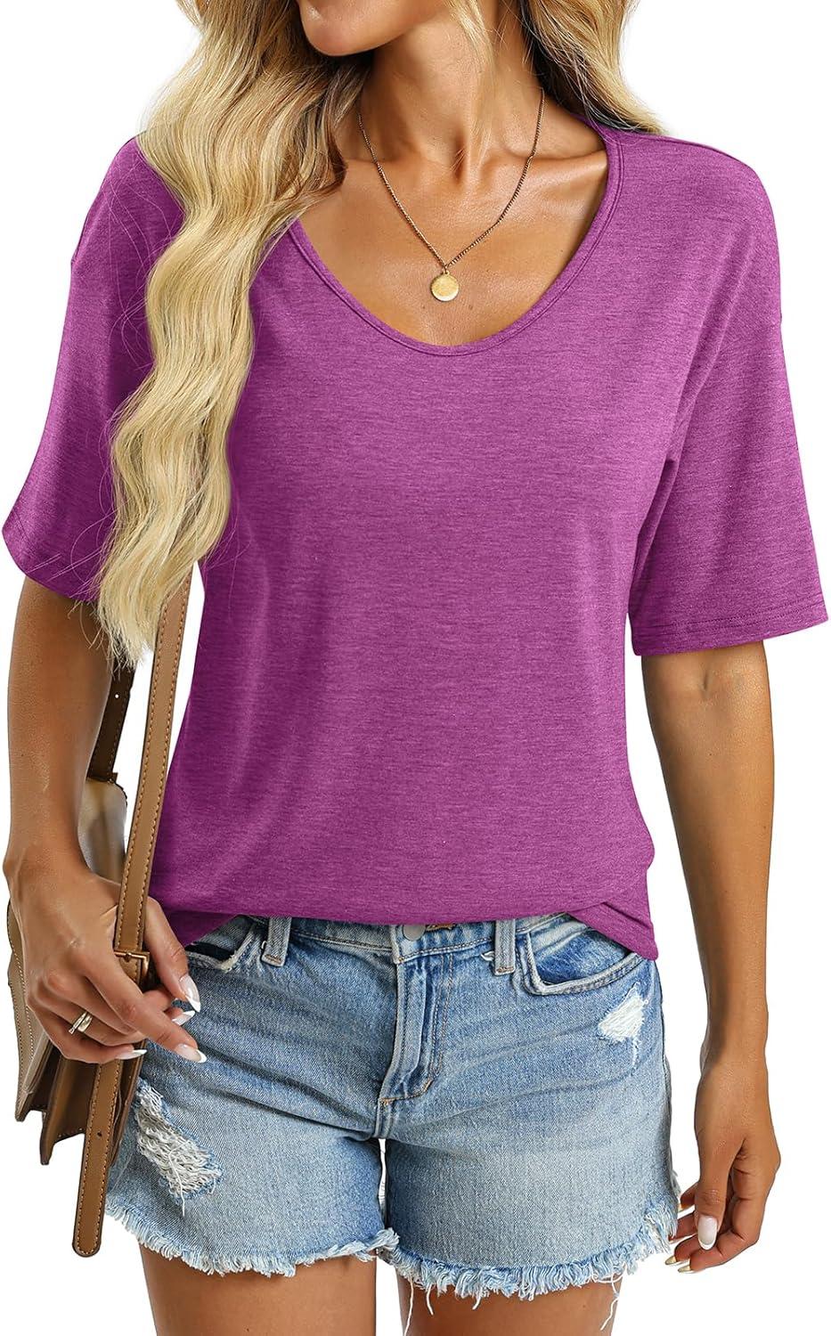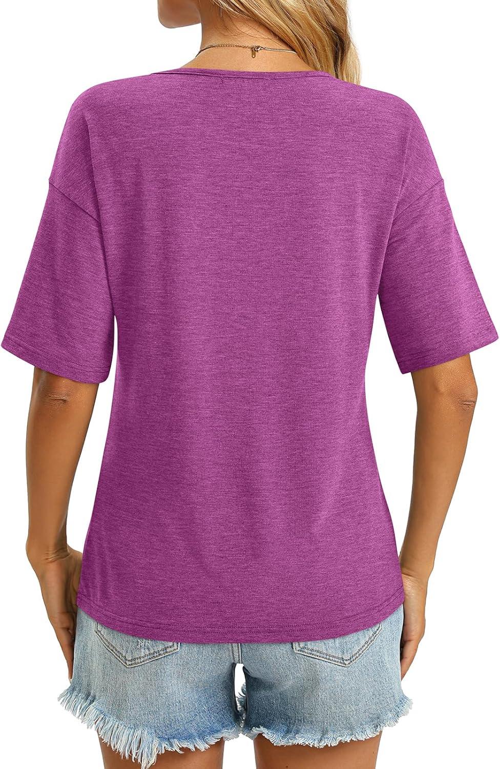 Women’s V Neck Tops Elbow Length Shirts Loose Fit Summer Tops Basic Tees(A Fuchsia (Elbow Sleeve))