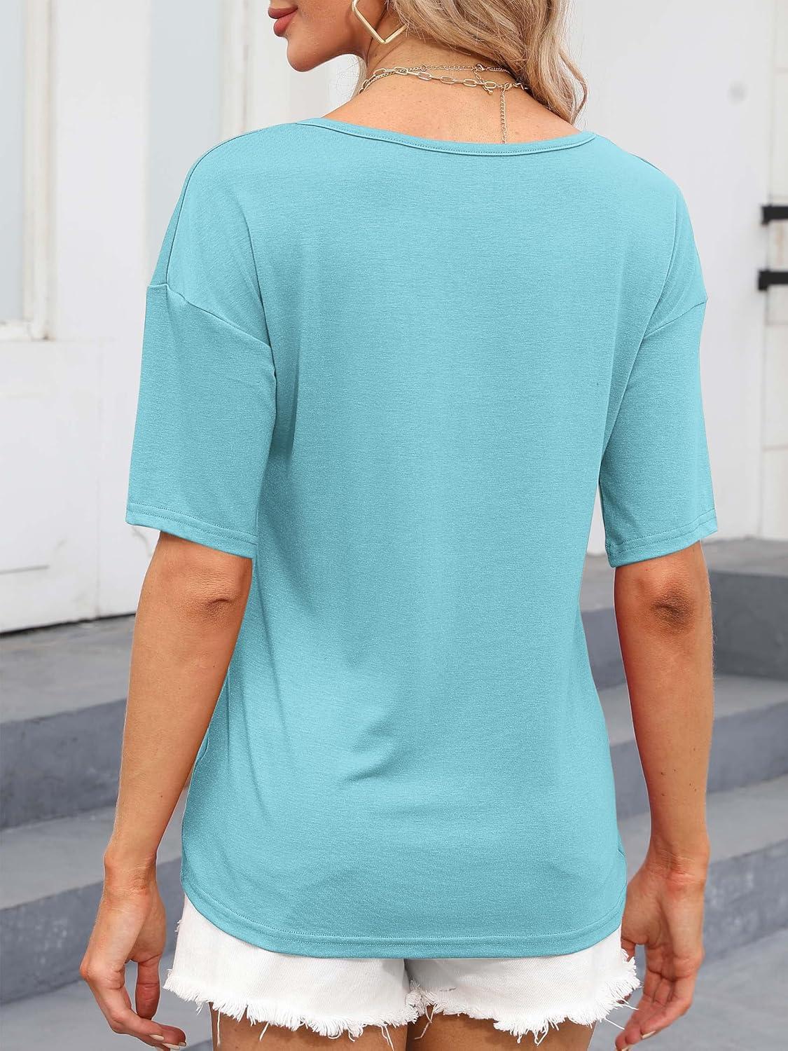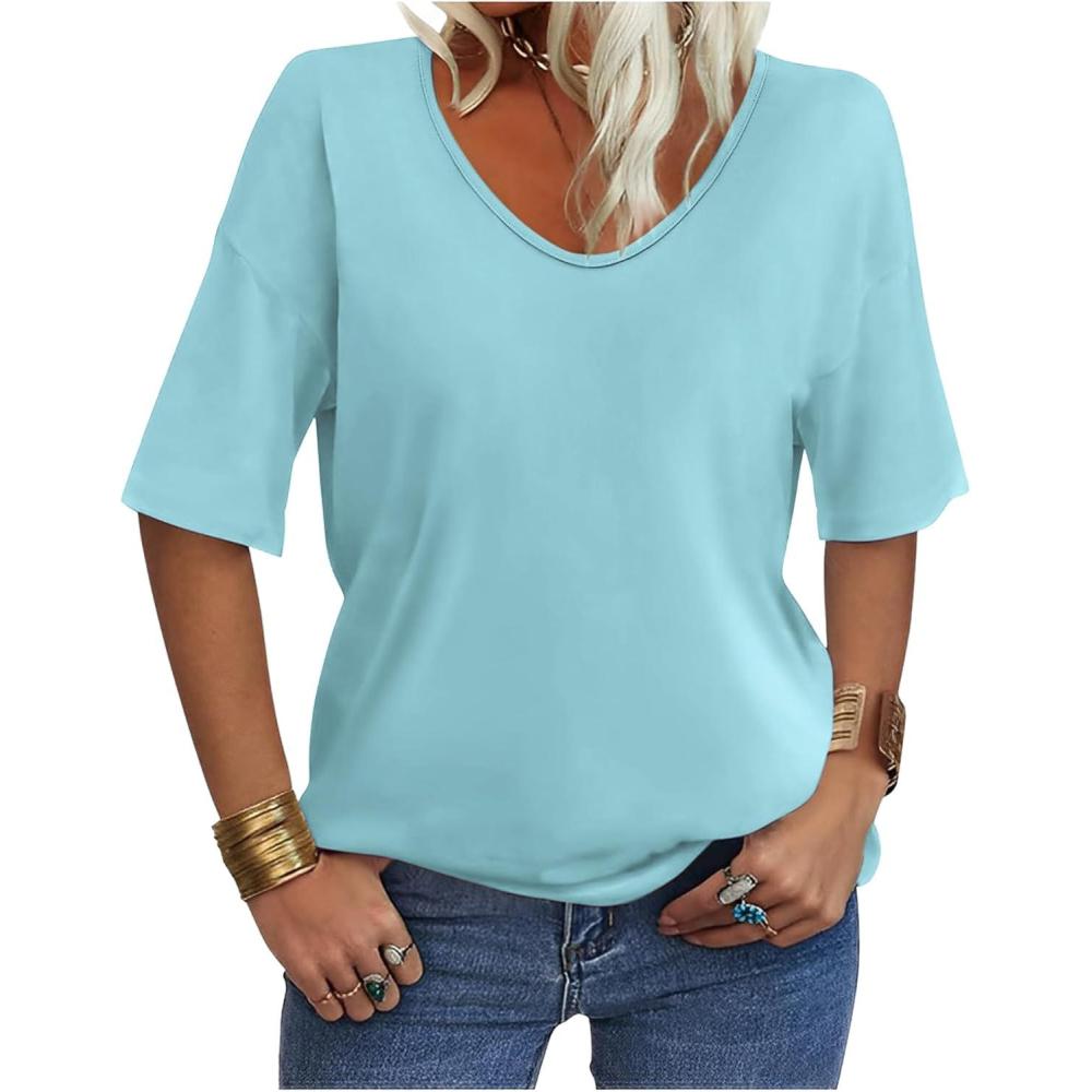 Women’s V Neck Tops Elbow Length Shirts Loose Fit Summer Tops Basic Tees(A Light Blue (Elbow Sleeve))