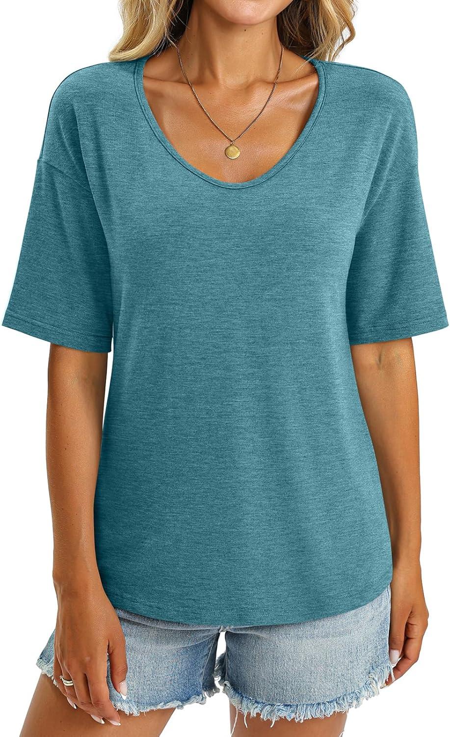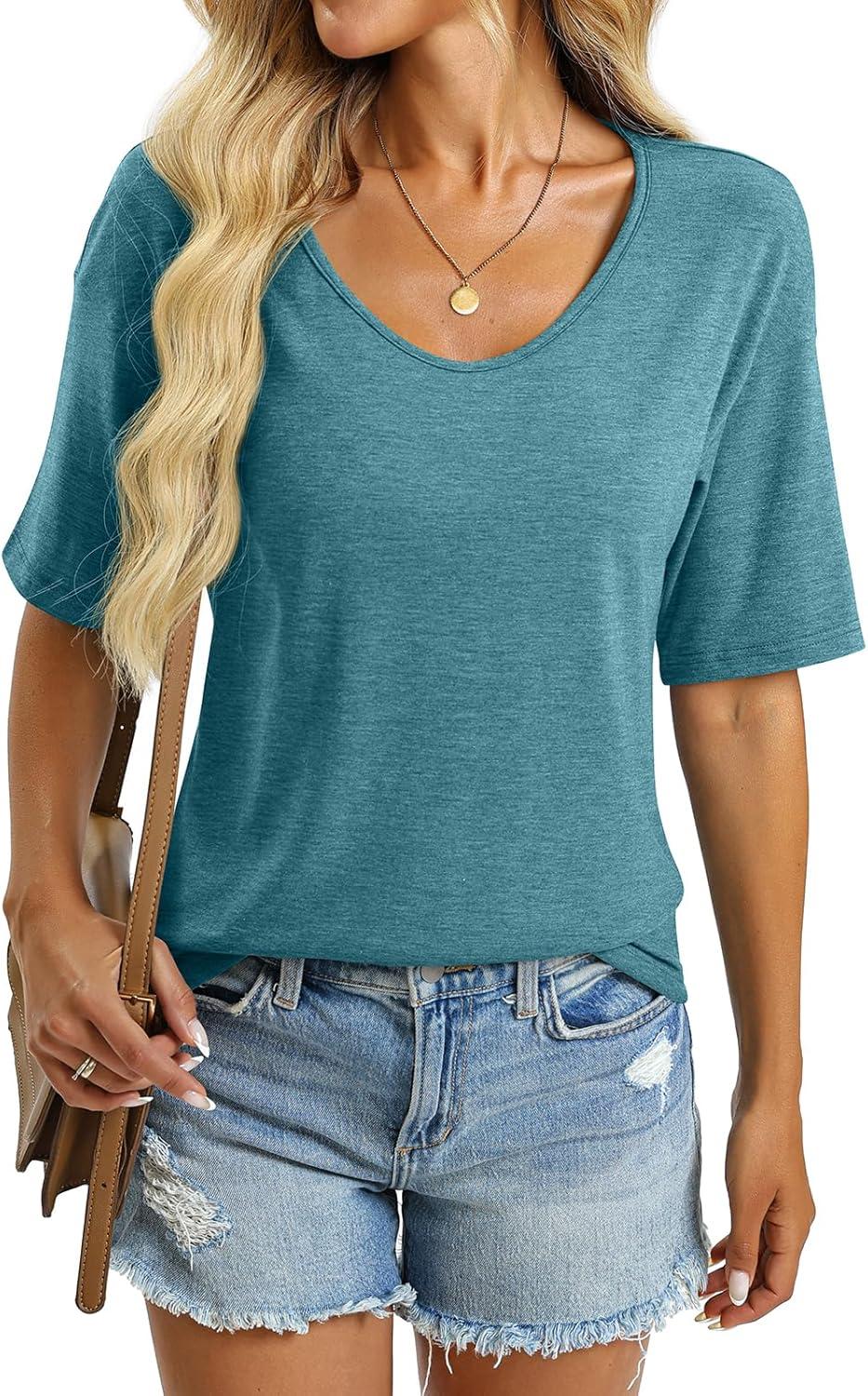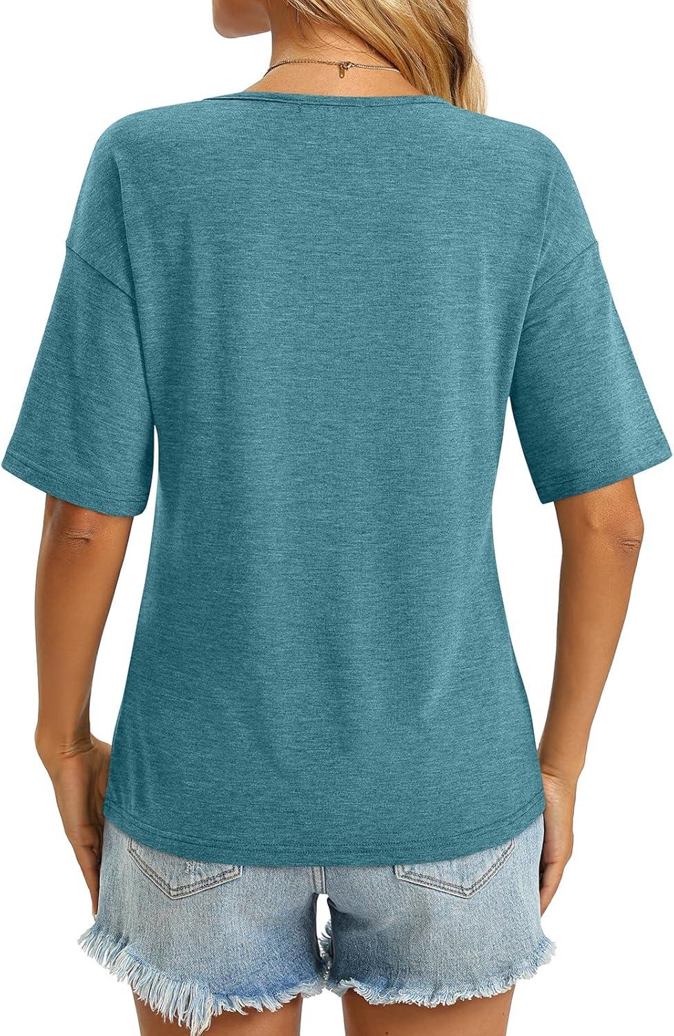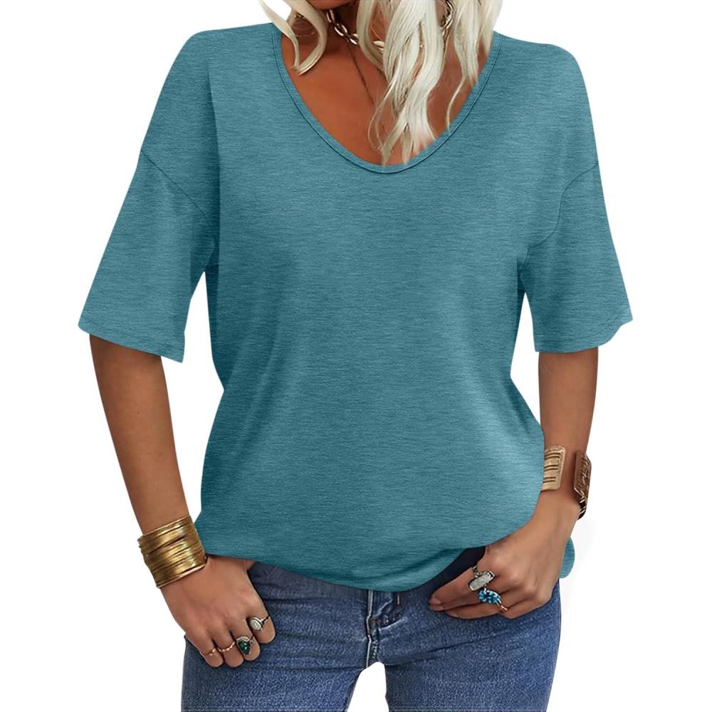 Women’s V Neck Tops Elbow Length Shirts Loose Fit Summer Tops Basic Tees(A Persian Green (Elbow Sleeve))